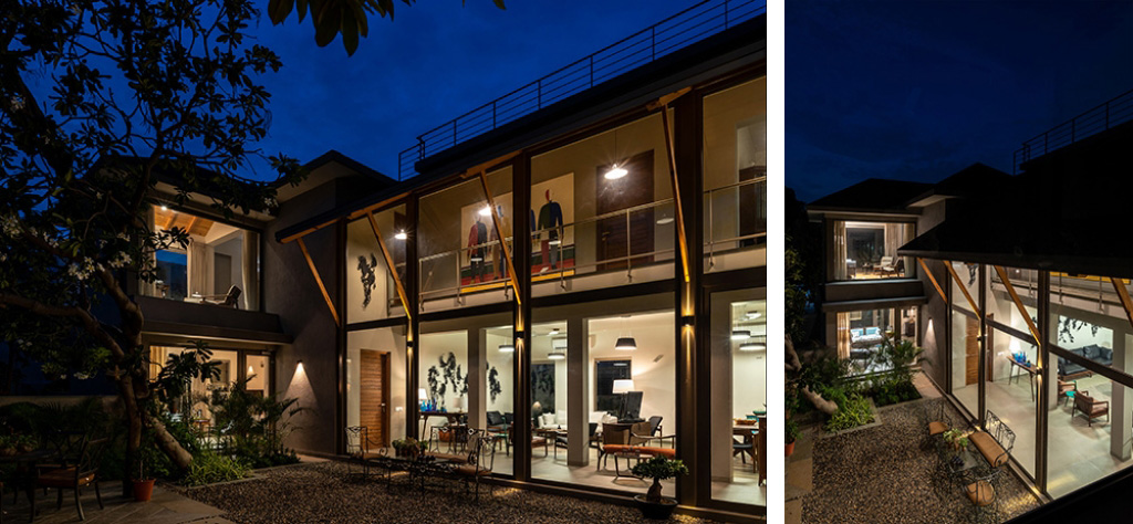 Use of matt materials, slender steel columns, large clear glasses, wooden ceilings and double heighted volumes – enhance the experience of open and large spaces, in spite of being in tight and dense plot. Soft color palate, ambient lighting, minimalist modern wooden furniture, vibrant artwork and pine wood ceilings provide intimate living experience.
