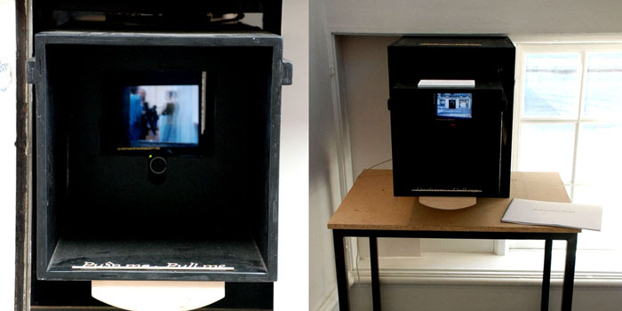 In this project, a two-way aperture with a memory allows an observer to relive and manipulate events that happened in the past. One can look through to the other side - and by pushing and pulling the box, can control the timeline of the event that they are looking at. The further you push, the further in the past you see. When static, the real time event is displayed from both sides.